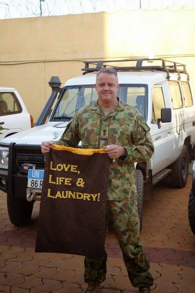 Thank you so much for the lovely laundry bag with my initials and the colourful reef fish that you made for me. It is a great reminder of our lovely country which I miss so much. I really appreciate the work you put in both for me and for other deployed ADF members.