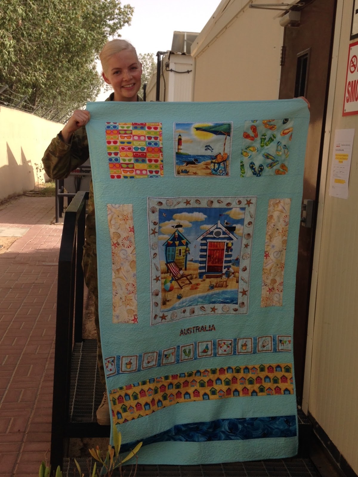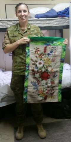 I recently received the quilt and laundry bag you made for me, and I had to send you an email just to say thank you; I think it is just the coolest thing I have ever ever received on deployment. I feel honored that people back home like yourself value and admire the work Australian soldiers do on deployment. My wife is also a fellow emergency nurse in major hospital so I can appreciate the time you have spared to make the fantastic quilt and bag for someone you have never met, I am so chuffed, so from the bottom of my heart thank you.