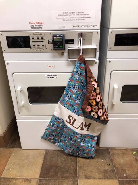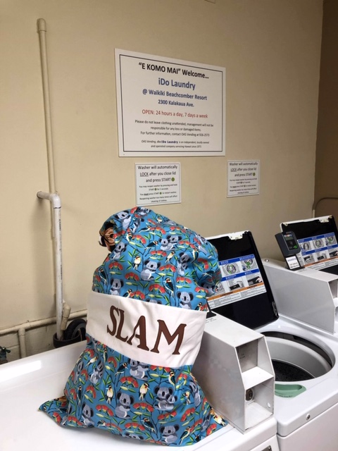 Yesterday I received photos of two of our laundry bags, made by Gail, doing duty whilst on holiday in Hawaii or all places….. the husband’s bag has travelled many places with his during his army service. The “SLAM” bag was actually a prize, the right to commission a LB, for this recipient’s wife which he won in the auction at our Dinner in 2017.