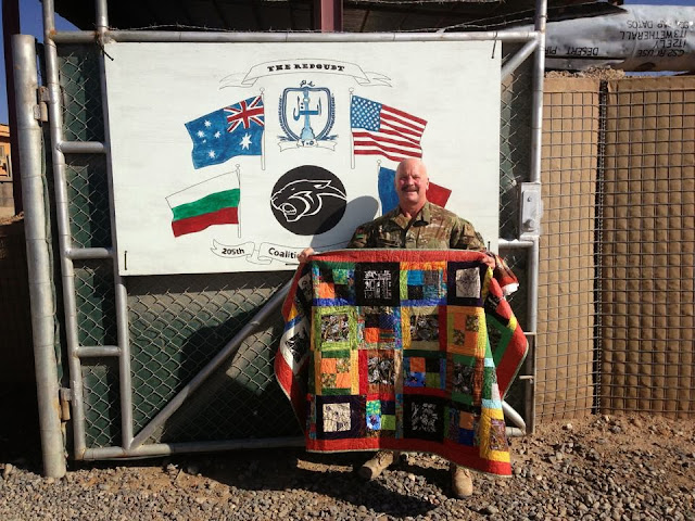 I’d just like to say thank you for your work coordinating this endeavour. It is much appreciated by all who have received quilts, and they became the ‘must have’ items here! All the ones that I have seen have been very nicely made and great keepsakes. Though everyone has used them here whilst deployed, the majority of members have planned who they will go to – some have them for their newborns when they get home, some for their other family members and some even for their grandchildren. Suffice to say, everyone is treating the quilts that they received on operations as special items to be used and passed in the family.