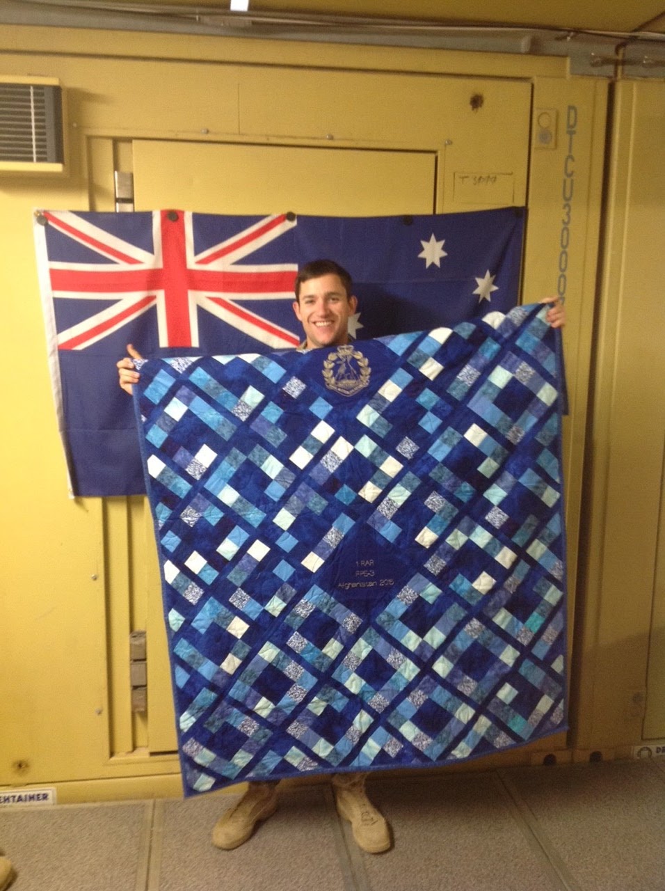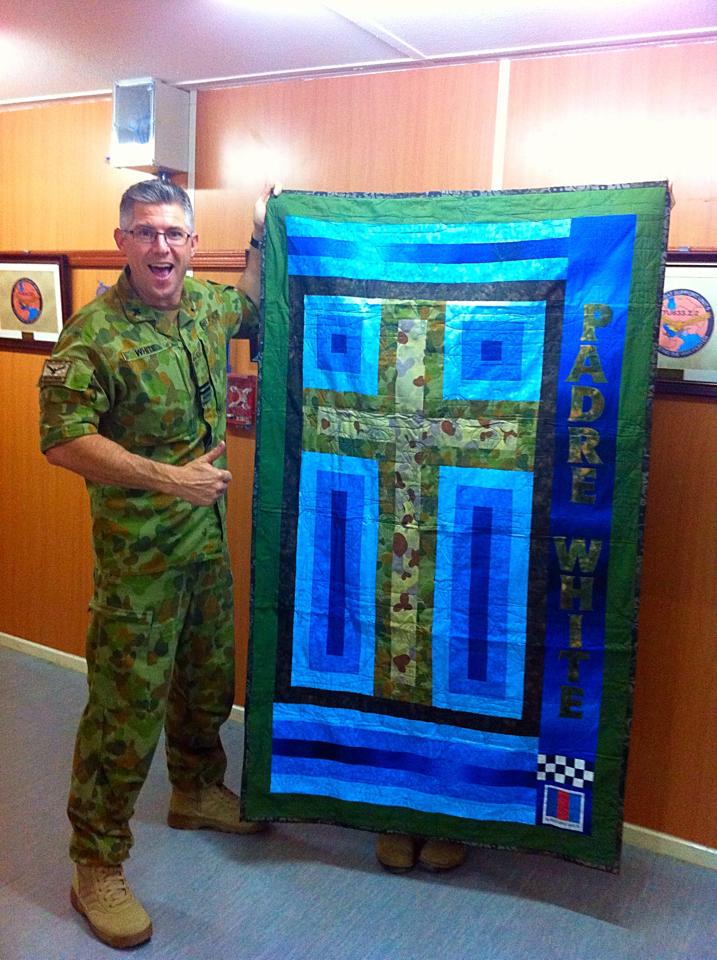 You work is out standing’ yes it is for my granddaughter when I arrive home. I put it on my bed for a photo and sent it to her.  She is over the moon and thinks her Pop is the best pop in the world and it is down to your hard work and Mary’s.   It is great that you are playing a part in the happiness of the defence members that are deployed as I have seen nothing but happiness in the eyes of deployed personnel when they have been showing off their quilts.