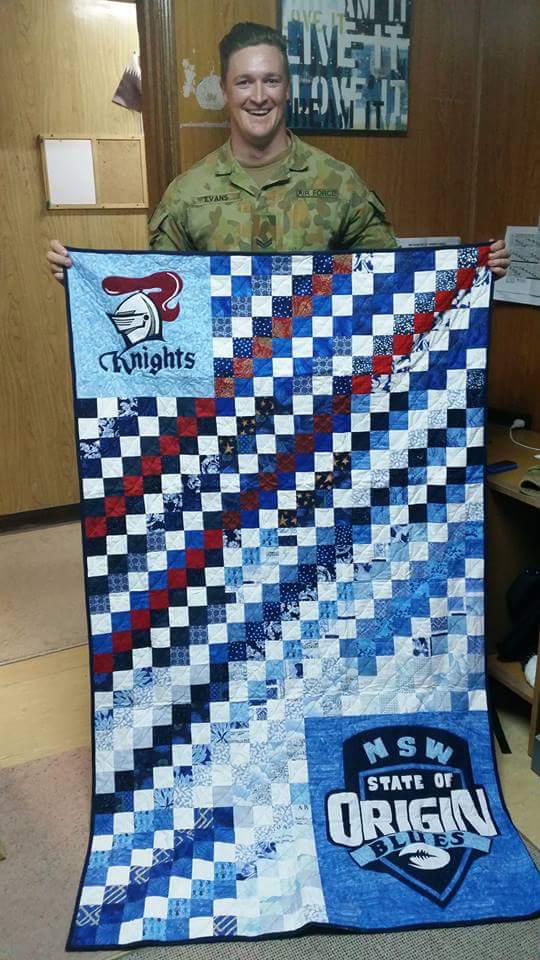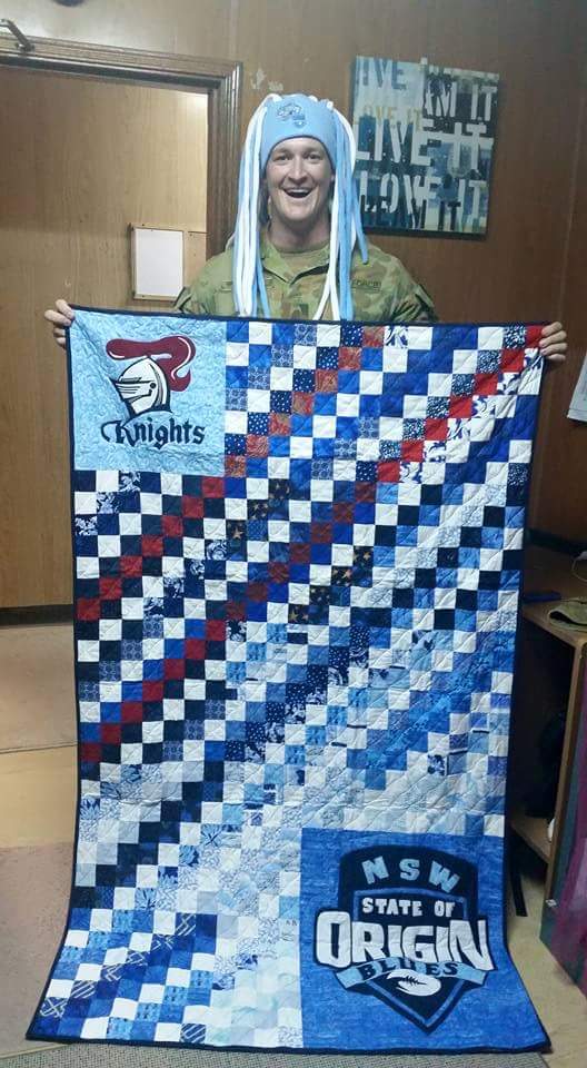 Finally, I am just over the moon with the Quilt and laundry bag! I cant praise you enough for the amazing design you came up with to incorporate the Newcastle Knights and the NSW State of Origin blues onto the quilt. I LOVE IT!. Everyone here has seen and commented on how great it is (even the Queenslanders). I immediately sent photos home to my family to show them and they all commented on how lucky I was to receive such a special item. I am unsure as to your background with making these fantastic quilts and laundry bags, but please accept my absolute praise for the amazing quality shown in the final result. My expectations were very much surpassed when I first opened the box to see the contents. I can not believe you actually made the Knights and NSW logo’s that are in the top and bottom corners of the Quilt, they are done perfectly and for a minute or so I thought they were an authentic match. The Quilt now brightens up my otherwise dull room here and I can not wait to take it home to show my family and friends. It really will be a special memory and I once again thank you for all of the items you sent me.