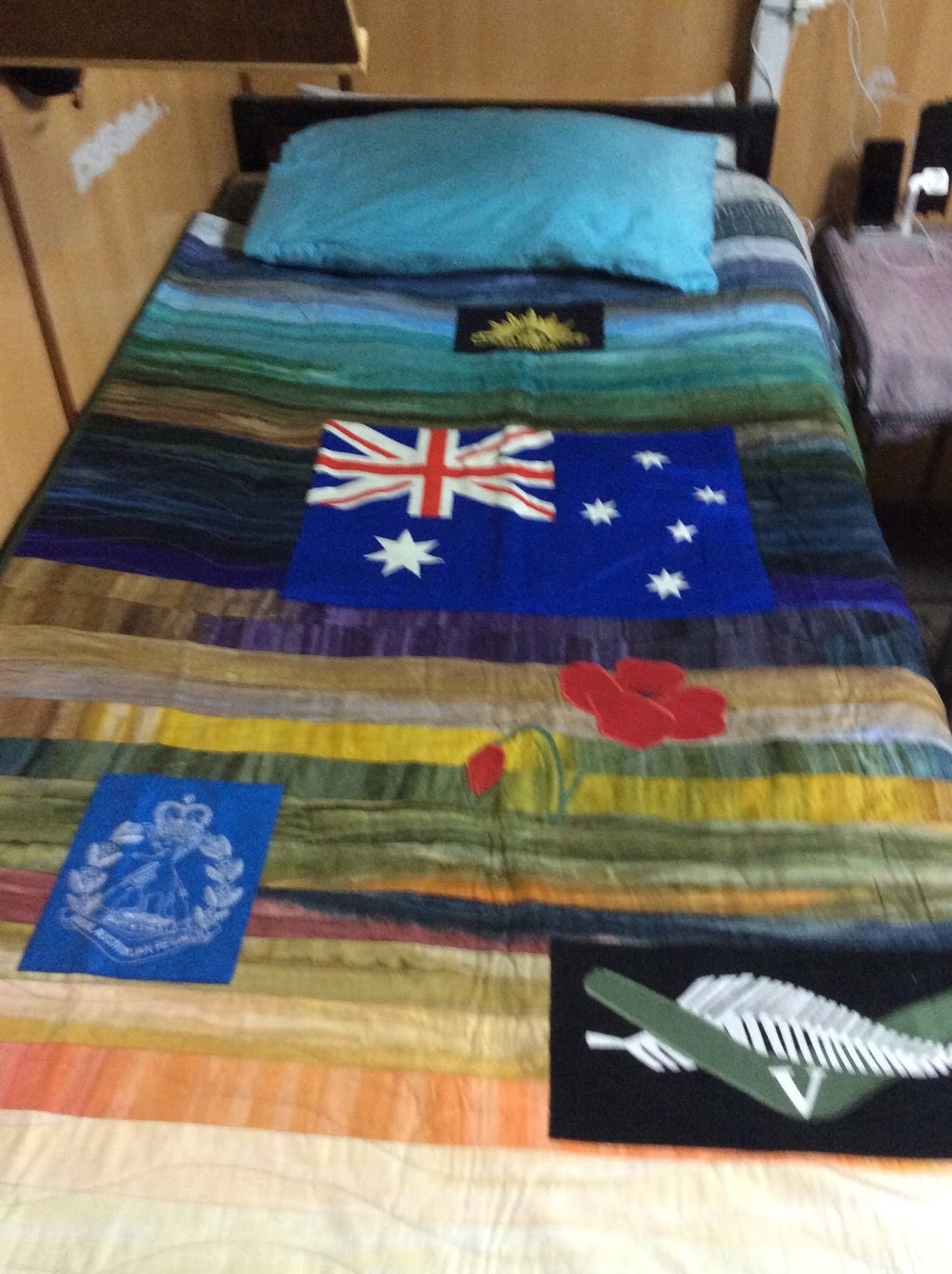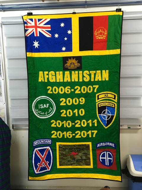 I can’t thank you enough for what you have done for me and what you are doing for our deployed troops. I have noticed that whenever I visit the troops in their accommodation blocks (usually either bombproof concrete buildings or armoured containers stacked on top of each other, and 1-4 people per room), the rooms are usually brightened by a dazzling and colourful array of quilts from Aussie Hero Quilts. Some are personalised for the individual, some (a lot!) depict sporting teams, and some are just intricate colourful patterns. Some of the quilts are used on the beds, some hang on the walls and some are used to create a barrier to make at least a little privacy in the cramped accommodation. They are all very much appreciated and the subject of much banter.