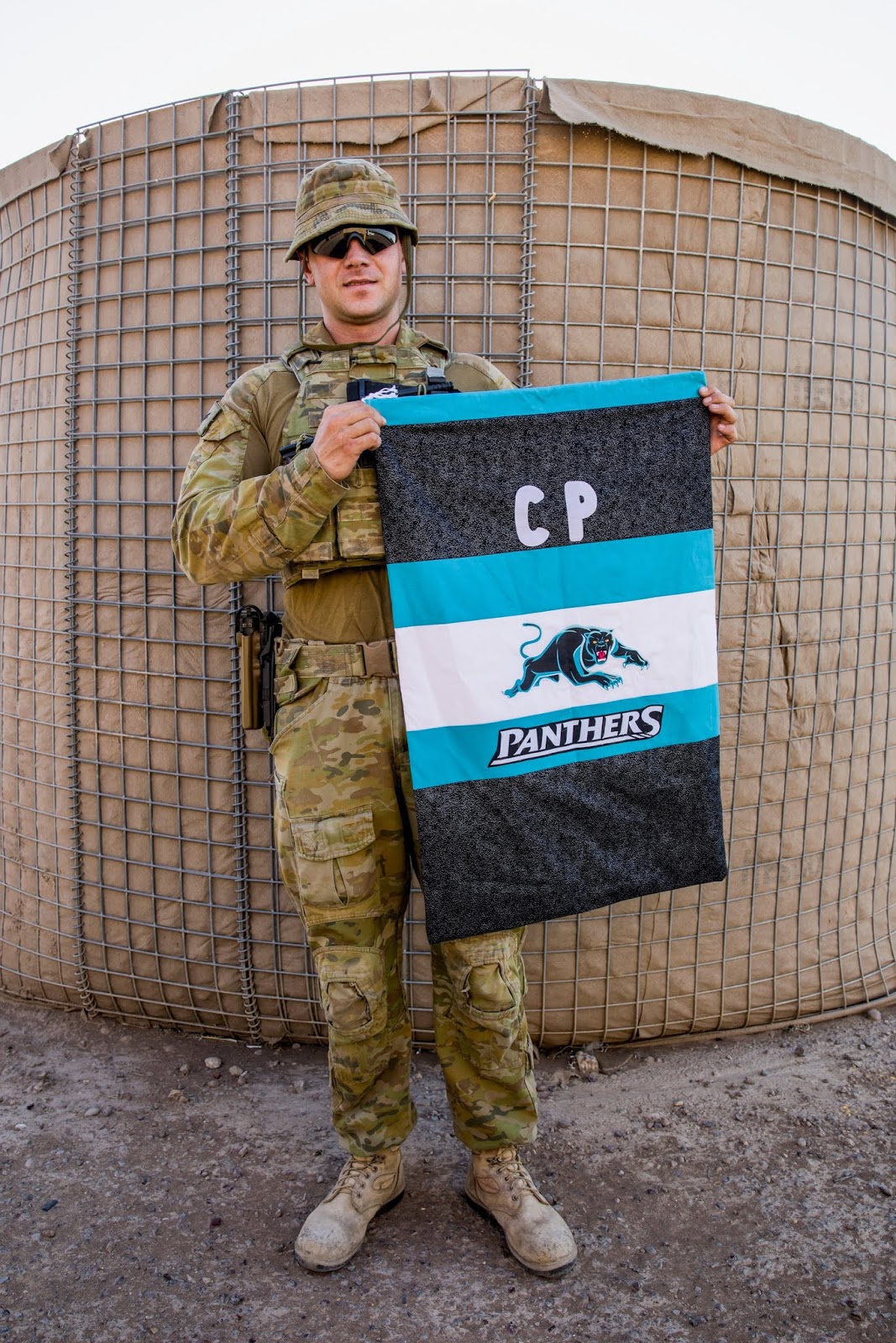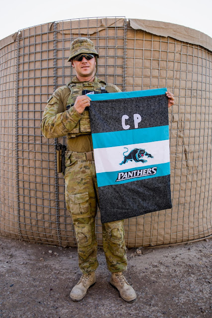 Thank you so much for my laundry bag, I will be forever grateful for this generous gift. I was one of the first in my task group to receive a package from Aussie Hero Quilts, so you could imagine the jealousy, if only they liked the Panthers as much as I do. You mentioned in your letter that you hope this laundry bag brings me some comfort as well as use. I would be lying to you if I told you I was ever going to use it, it’s that fantastic I have it hanging on my wall next to my jersey 😊.