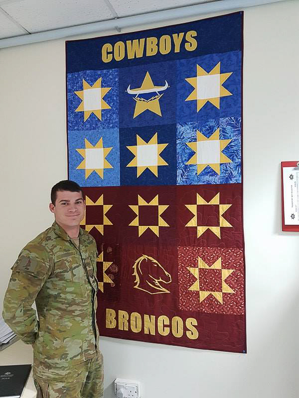 I would like to say a huge thank you for the fantastic quilt that you made for me. It looks fantastic, and I love the Collingwood theme that has been incorporated. The quilt came at a perfect time for me, almost exactly half way through my deployment. At this time in a deployment, knowing that you still have a few months to go can be a little disheartening, however, the arrival of the quilt definitely lifted my spirits. Again, thank you very much.