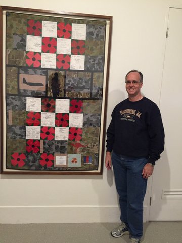 Joan, is one of our long standing laundry bag makers and Chris, her son, is one of our recipients from HMAS ANZAC, the first ship we looked after. Chris was in Canberra on the weekend and sent in this photo of himself with the quilt. He is justifiably proud that his mother contributed a square to the quilt and so took the opportunity to check it out. Thanks for the photo Chris.