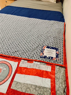 The letters that accompanied the quilt were also very thoughtful and he loved reading about the ladies lives and how they came to make his quilt.  Please pass on both his and my heart felt thanks to those lovely ladies.