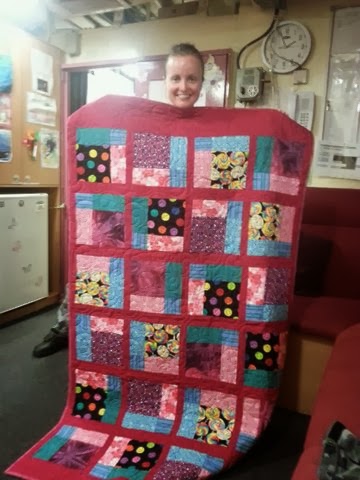 The following email is from a sailor on HMAS Melbourne who requested a quilt for her daughter instead of herself. You might remember that it was one of the Mystery quilts we did with pink and pale purple four patches which were sent to Debbie to turn into a quilt. Debbie also made the recipient a laundry bag and sent it to her separately a little later.