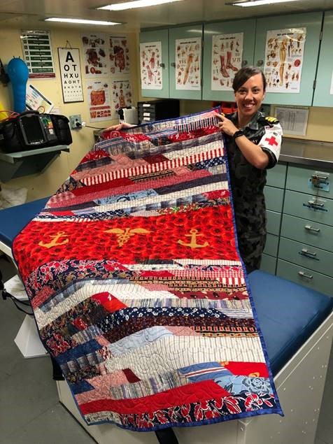 Just wanted to say a huge thank you for the beautiful quilt you made me. It has really made my deployment! All my favourite things too, and at such short notice, I really appreciate it I’ve attached a photo of me with the quilt in my ‘sick bay’. This is my work place on the ship, and I share this and a small office area with two medics (as you may know, medics in the Navy are trained as sort of half way between paramedics and ENs). So interesting that you’re a nurse!