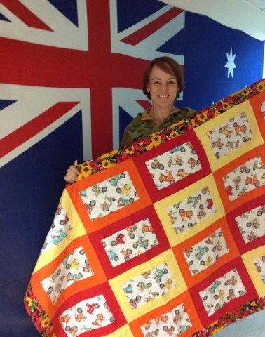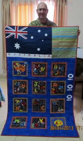 We had a great Australia Day and I hope you did as well. Now for the best news of the weekend…..when I arrived on Friday I helped unpack the recent delivery of mail from Australia and found a parcel marked for me from you. Thankyou Jan-Maree, the quilt and laundry bag look fantastic. I am extremely grateful that you could take the time to make these wonderful gifts for me. The design and detail that has gone into the quilt is amazing. The quilt has pride of place on my bunk and it will remind me of home and your remarkable kindness whenever I see it. The whole contingent here is South Sudan also greatly appreciate the efforts of you and your team that go into co-ordinating these gifts for us and for other personnel deployed on Operations around the world. The work you and your team are doing has a positive impact on our morale and reminds us of all the support from home.