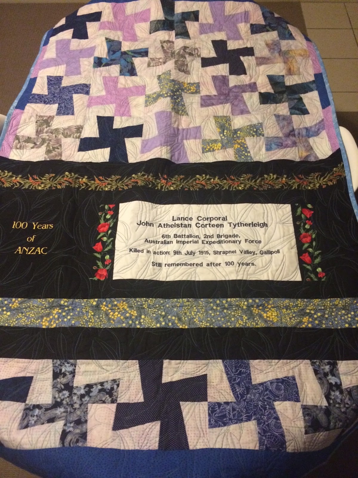 My quilt made by Norma is wonderful, it is in red and black representing my Regiment’s colours and Essendon my favourite AFL team.