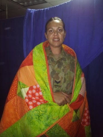 Good day, just a quick email to thank you for the quilt !! It was a great surprise to receive it and just in time as its starting to get cool at night, it is well made and a credit to the talented people that are making them. It is something I will treasure, I am here until December its is very mundane work here at the moment and were all looking forward to getting home o our families for Christmas. Again thank you very much