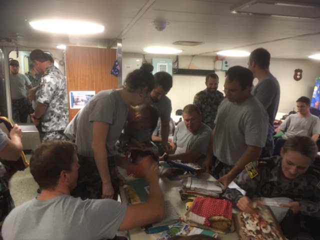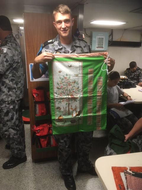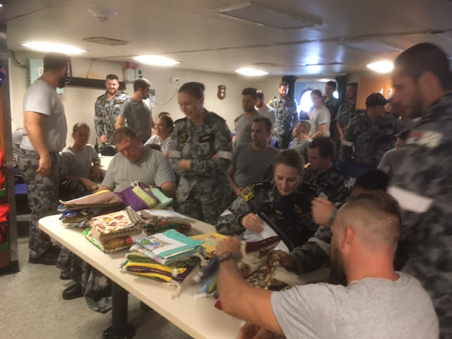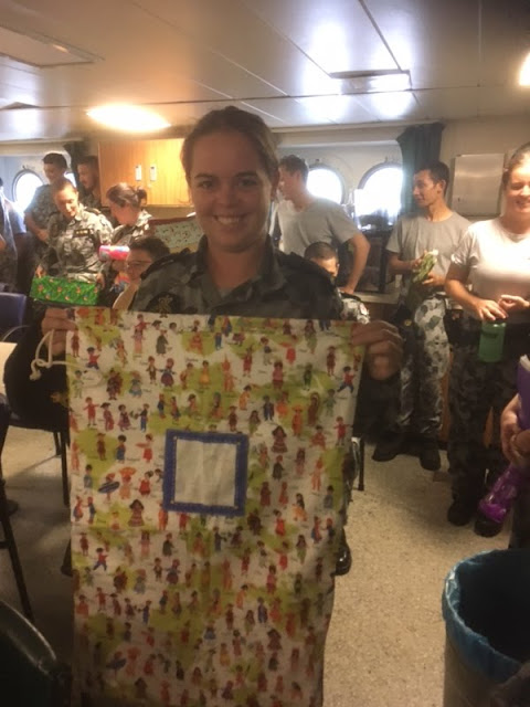 HMAS Melville has just received a batch of laundry bags. They were delivered to the ship by one of our wonderful Navy Chaplains, who let told us: