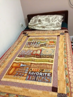 Last night I shared a thank you message that a fellow sent for a quilt that Jenny and Gale had made. he promised to send me some photos and he promised to include the, in his words “the aggressive salmon wall” behind his bed.