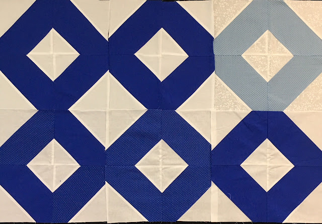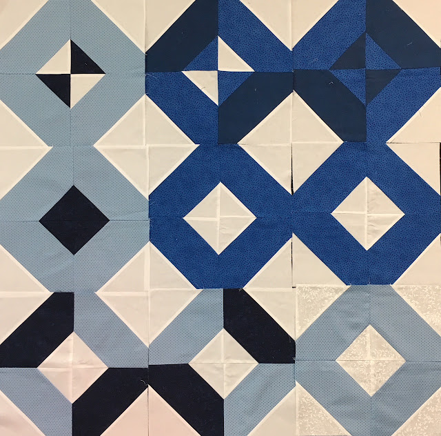 I love the way our BOM volunteers have played with the blues and white to create the Donut blocks.