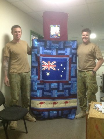 To the ladies of Aussie Hero Quilts, thank you so much for my quilt and laundry bag. It is really nice to know that you guys put so much time and effort into these quilts. It really does mean a lot to know we are thought of and that what we are doing over is worthwhile, so again ladies, thank you so much. Very proud of it. Thank you again.