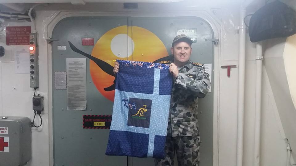 Today several of HMAS Darwin’s former Commanding Officers joined the ship and were presented with the laundry bags we made them as a surprise.  Among the former CO’s is CAPT Terry Morrison, who commanded HMAS Darwin when they deployed for the first time with Aussie Hero’s Support.
