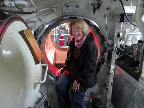 After the pleasantries and much ado, Jan Maree was seated, given a mug of coffee (not tea, not complaining) and I was taken aboard the submarine.