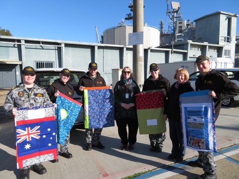 All to soon our visit to HMAS Waller was drawing to a close, but not before the Commanding Officer, himself a recipient of a quilt, met with Jan Maree and myself and, of course, the obligatory photo.