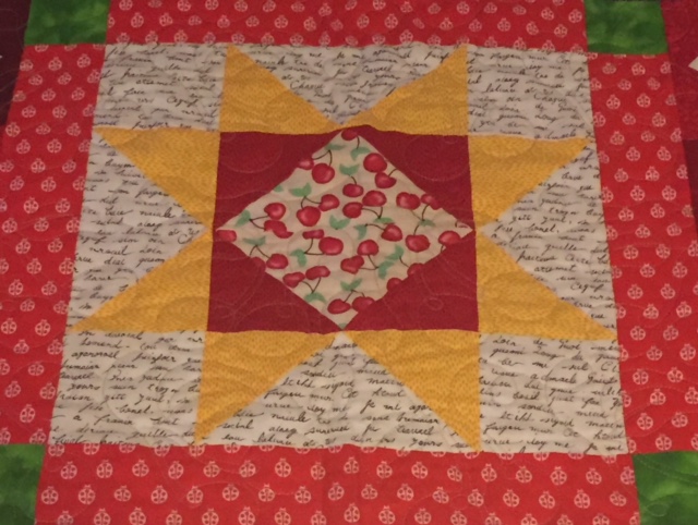 The next task was to quilt it… I found the perfect cherry design and set to get the quilt finished. I had planned to have it finished for the AHQ dinner… but found out that I was unable to attend because of work commitments, so I aimed for her birthday.