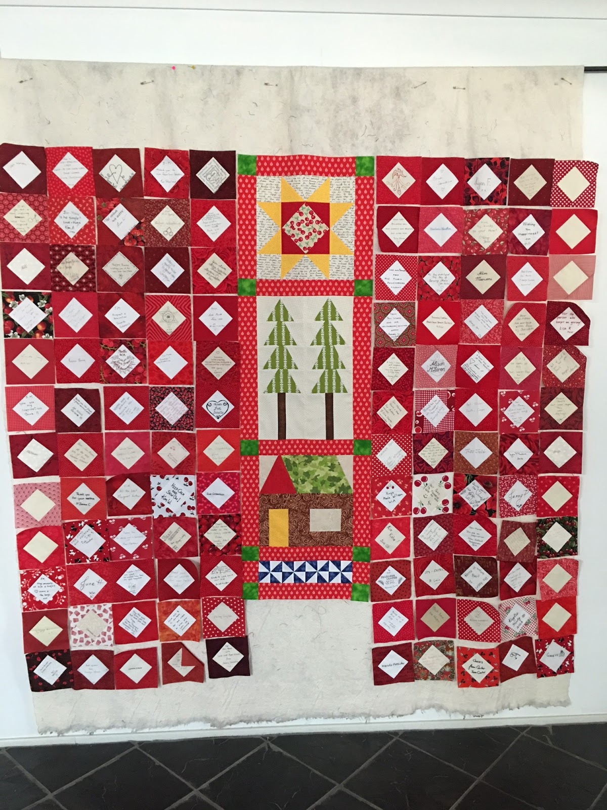 The idea behind the quilt was not to replicate it but to create something unique that lots more quilters could be involved in. I remembered the quilt that was on the back wall of Jan-Maree’s lounge room and that featured in many a photo on the AHQ blog and facebook page. This quilt was also destroyed. Here is the link to the original story. JM’s quilt 2013