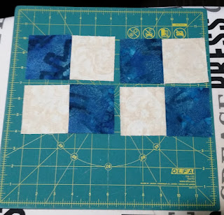 Stitch the 3in squares together into pairs and press the seams towards the darker fabrics.