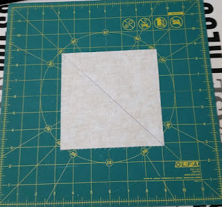 Use a pencil to mark a line diagonally on the wrong side of the 5 7/8in light tone-on-tone print square.