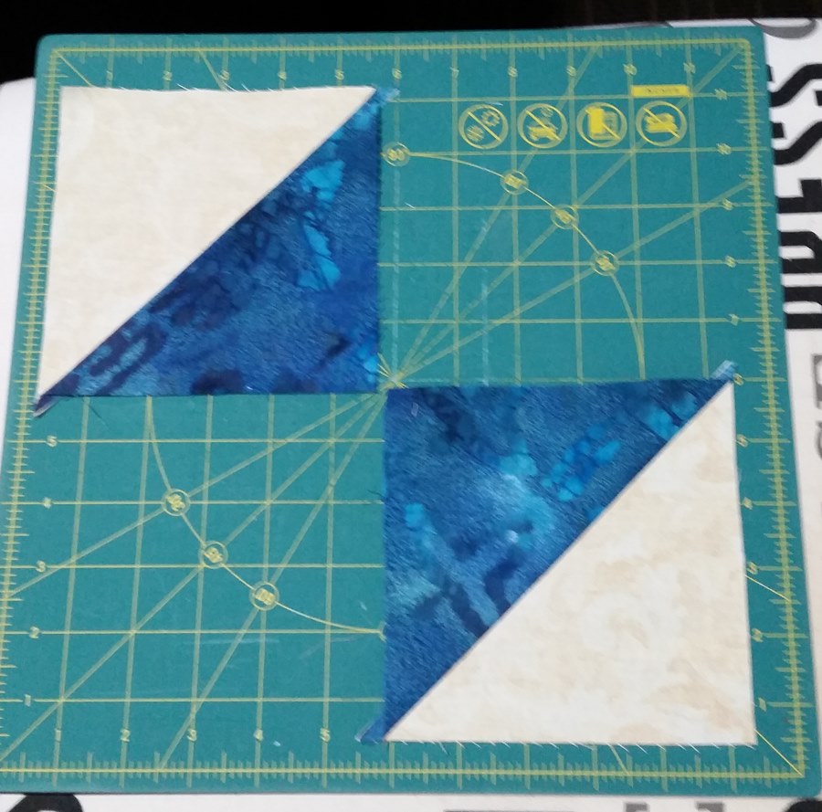 Press the two half-square triangle units just created with the seam towards the darker fabric. These should measure 5 1/2in square. Trim any excess fabric.