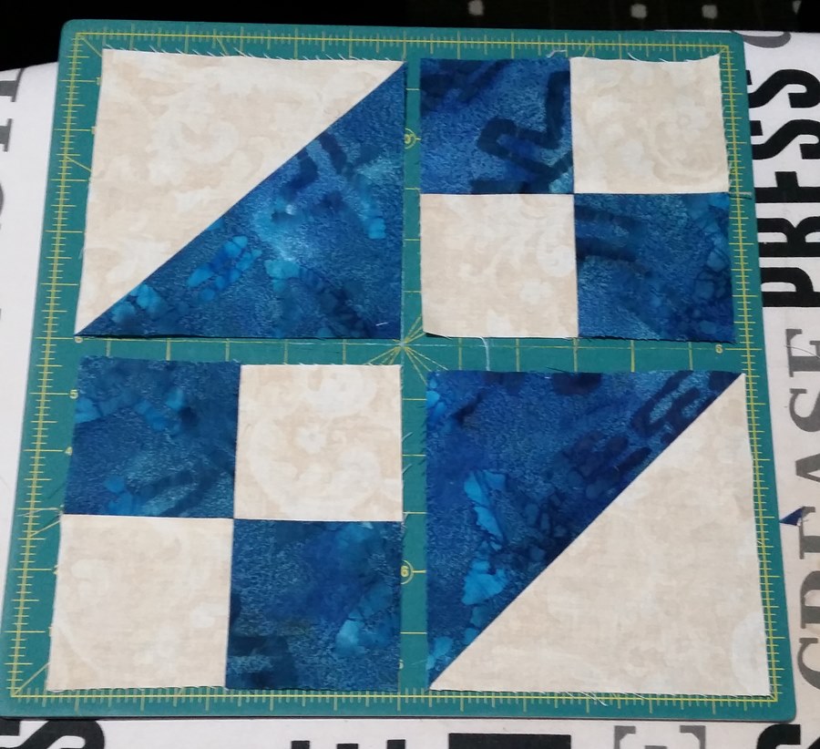 Sew the pairs together into two, four patch units, the seams will lock at the intersection.