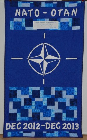 Some months ago I received a request for a quilt with the NATO-OTAN logo on it. Now I am not going to explain all about NATO in this post as I am too short on time but briefly the NATO (North Atlantic Treaty Organization) is an international alliance that consists of 28 member states from North America and Europe. It was established at the signing of the North Atlantic Treaty on 4 April 1949.