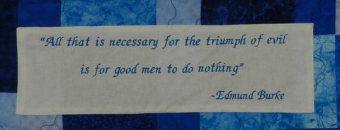 I wasn’t sure that anyone would take on the challenge of this one but eventually my friend Louise agreed to give it a go and did a fabulous job. One Louise had finished the quilt top, it went to Carol for quilting and then cam back to me. I added the quote that Michele from Melbourne had embroidered for me.