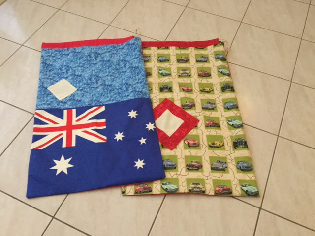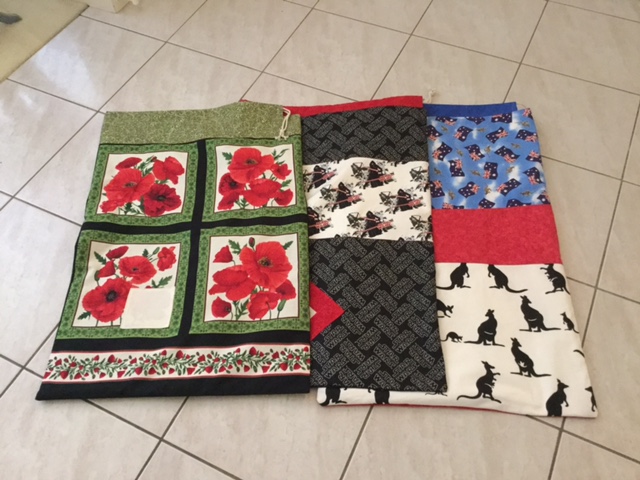 And finally……. please do not use those thin nylon flags on the quilts and bags… I am not convinced that they will survive prolonged use when washed in industrial dryers and washing machines and what a shame for a recipient to have his bag or quilt ruined by a shrunken and frayed Aussie flag. Awesome flag panels, like the one above, come from Spotlight… they last just fine.