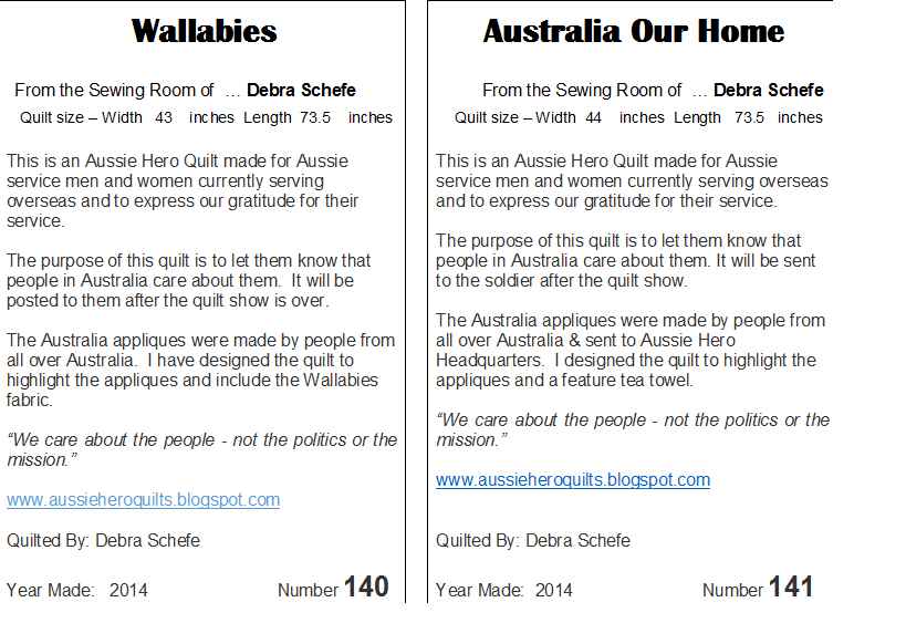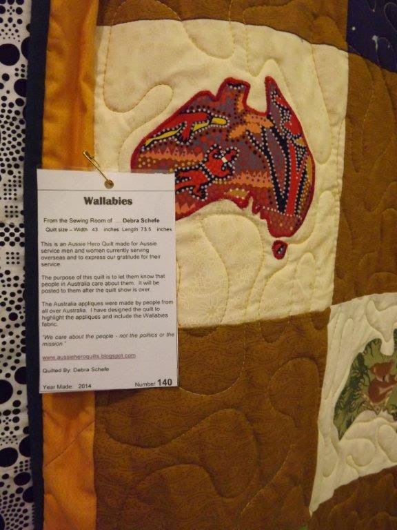 These 2 quilts definitely raised the profile of AHQ in Roma & she has had a few people ‘hunt’ her out to say thank you for the contribution we are making to our soldiers.  Her local RSL was ‘shocked & stunned’ that people with seemingly no connection to the military would want to be doing this.  They are hoping to add AHQ to their local service information.