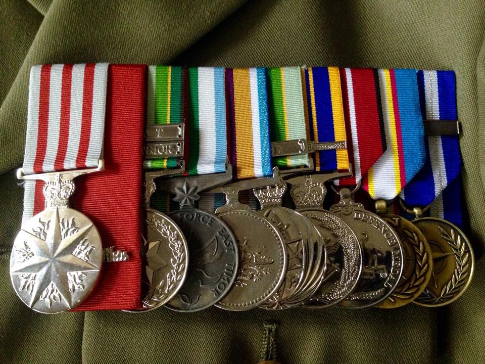 The Distinguished Service Medal, The Commendation for Distinguished Service, The Australian Active Service Medal with East Timor, and ICAT Clasps, The Interfet Medal (International Force East Timor), The Afghanistan Medal, the Australian Service Medal with clasp CT/SR (CT- Counter Terrorist and SR – Special Recovery), Defence Long Service Medal with clasp for 20 years, Australian Defence Medal, United Nation transitional Authority in East Timor Medal, the North Atlantic Treaty Organisation Medal with ISAF Clasp.