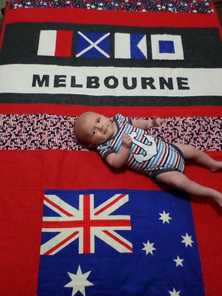 I just wanted to say BIG Thank You for my hubby’s amazing quilt. He is home now from Op Slipper and met our son for the first time on the wharf, his quilt is a wonderful addition to our son Aiden’s room.