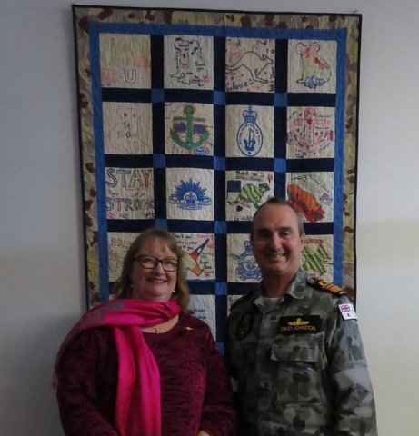 After lunch I whizzed out to HMAS Harman to have a quick cuppa and a catch up with the Commanding Officer, the Executive Officer and the Ship’s Warrant Officer. The CO received a quilt and a laundry bag whilst she was deployed a couple of years ago. The XO received a quilt while he was deployed in South Sudan (I think) and the SWO received a laundry bag last year as a thank you for helping us to arrange our dinner at HMAS Harman.