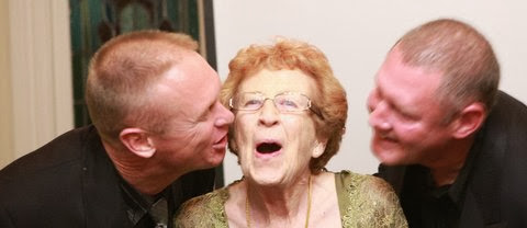 Pauline came all the way from Mackay to attend the dinner with her two daughters Elaine and Rhonda.   This was a special girls weekend in Brisbane to celebrate Pauline’s 85th birthday so Angela and I decided that we had to mark the occasion in a special way.  First came a kiss on the cheek from two handsome heroes (really……what more can a girl ask for???) and don’t the photos tell the story???