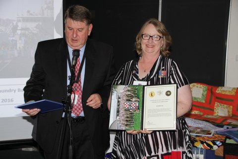 When my home was destroyed I lost my copy of the certificate and presentation photo that all who participated in the construction of the Centenary Quilt received. On Saturday night RADM Jones presented me with another copy of the certificate and photo,
