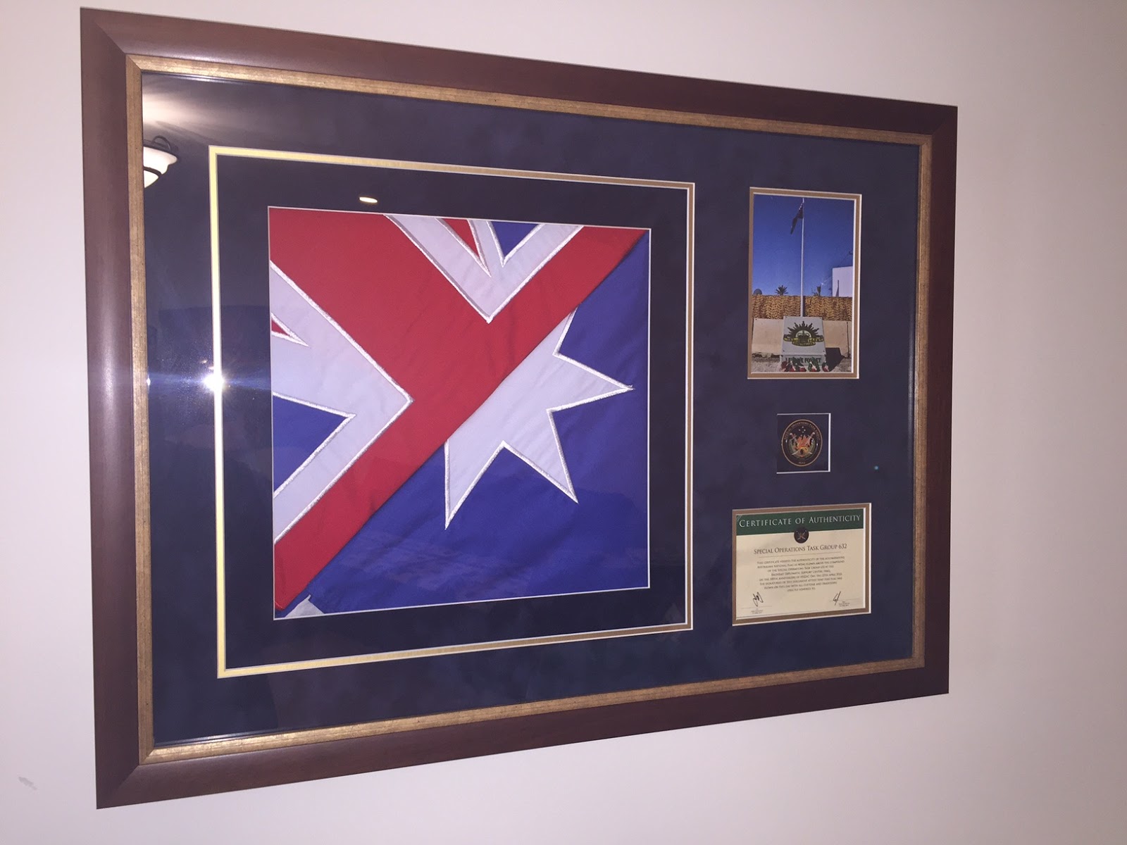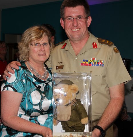 As most of you know, unless you have only joined us recently, this has been one heck of a year. At 1am on the 12th of June, my son woke my husband and I to tell us that our house was full of smoke. Ten minutes later the entire house was engulfed in flames. We got out with our lives, our dogs and a car load of quilts. As well as losing our home and most of the contents, I lost all of my Aussie Heroes infrastructure, resources and my laptop, with all my records on it. I also lost just about all of my memorabilia from nearly five years of running Aussie Heroes. One of the few pieces that survived the fire was a flag that was flown over the base in Iraq on the Centenary of ANZAC Day last year and was given to me by a commando. I had sent it off to be framed and the Kirsty and Alex from Lone Pine Medals delivered it at the dinner. They were the only ones I would trust to frame it. The girls do beautiful work but they are also a class act!