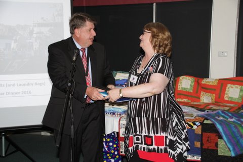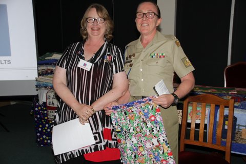 A big thank you to Chief Petty Officer Cath Harvey, not only a recipient, but also a quilter, for sorting the quilt frames, name tags and directions. Cath also sold RSL Poppy badges on the night….