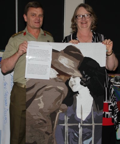 We also auctioned off the evocative quilt called “The Reunion” made and donated by the very talented Lucy Carroll. This was won determinedly by BRIG Matt Hall and I am told that as soon as his wife, Amanda, saw it, she said that after so many deployments she related to it and was intent on taking it home. I have heard that it was hung in pride of place in their home that very night.