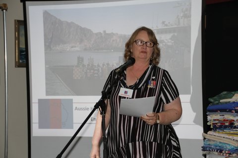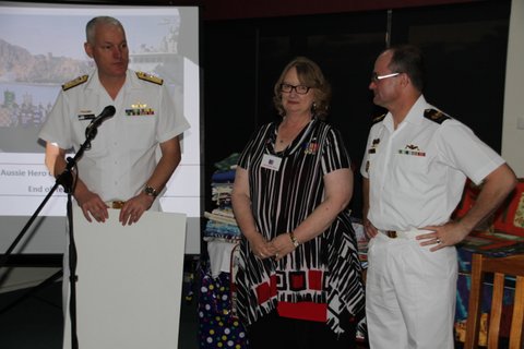RADM Jones, was the Commander of the Joint Task Force in the Middle East until January this year. He did not know about Aussie Heroes until he arrived in the Middle East and then was so impressed by the impact we are having that he came up with the concept of the Centenary of ANZAC Quilt that we all remember making and presenting to the Australian War Memorial last year. As he pointed out on Saturday night, that is the ONLY quilt that has flown all around the Middle East, in a Hornet, in a C17, as well as going into Afghanistan, onto HMAS Success and so on.