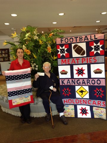 At last the quilt was sent off and we had to wait a little longer than normal to hear it had returned as the recipient had a couple of weeks leave around the time it arrived. Finally Margaret and the residents could wait no longer (and I know just how they feel) and so I emailed the recipient to see if the quilt had arrived. Yes it had and doesn’t that smile speak volumes.