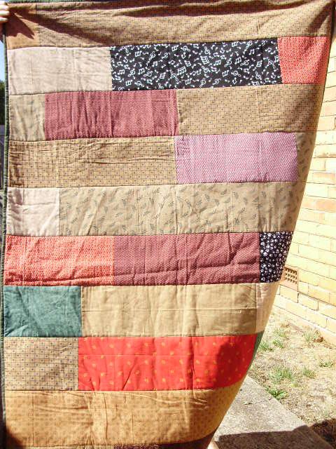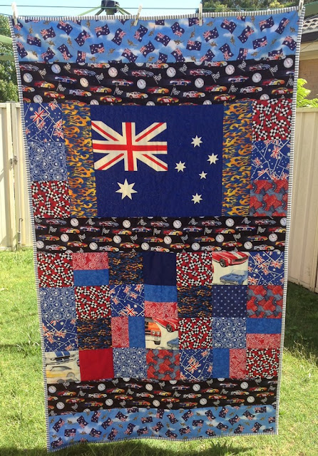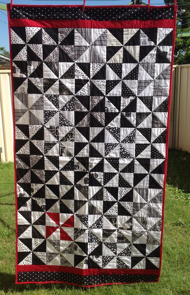 This was a joint effort. Pauline made all these blocks and sent them in. They were put together at a sewing day and Caroline then quilted and completed the quilt. The end result is an AWESOME quilt heading off to an Essendon fan. Hope he likes it.