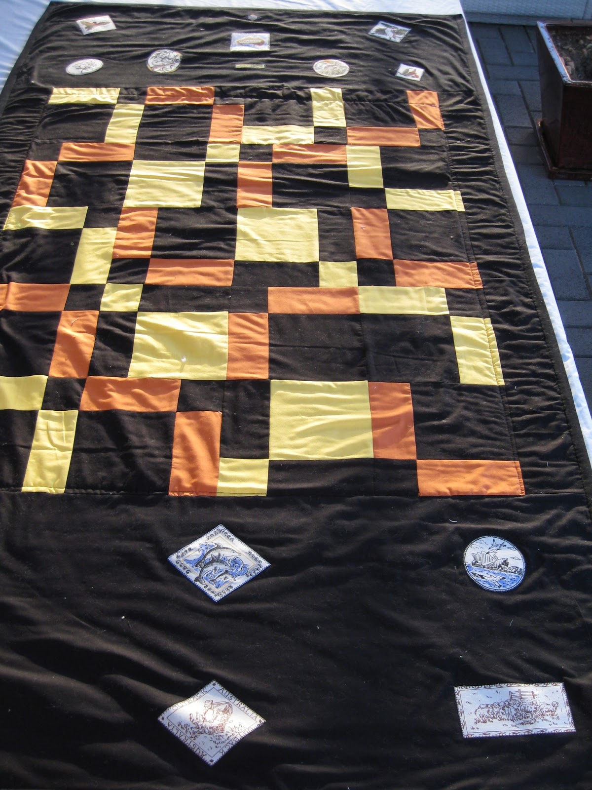 I managed to sneak another one in this week. I pieced this and Carol quilted it for me. Michelle also embroidered a panel for the back but I better wait till it has been received before I show you that or it might give the game away.