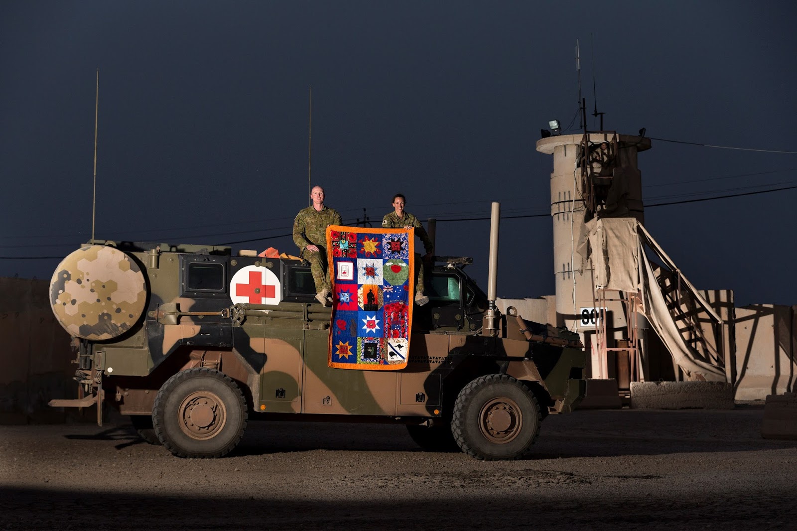 “The quilt was presented to the Role 2E medical facility and was made in recognition of the combined nature of the Australian and New Zealand task group. The quilt features red poppies, a ‘Lest we Forget’ inscription, and silhouette images taken by the Task Group Taji photographer.”