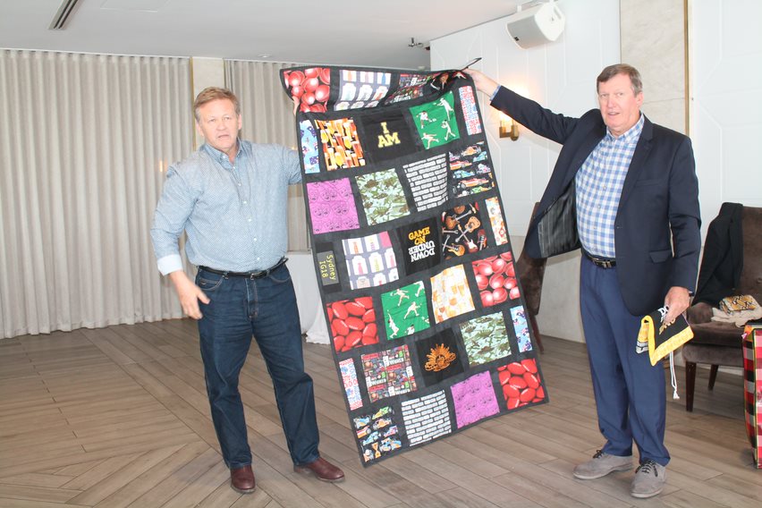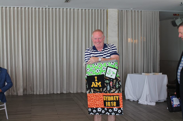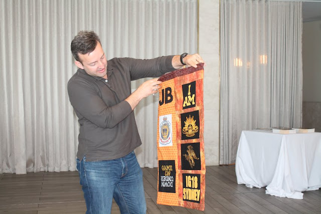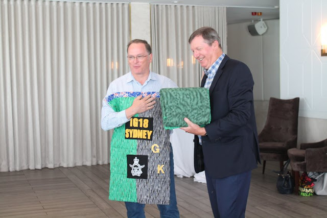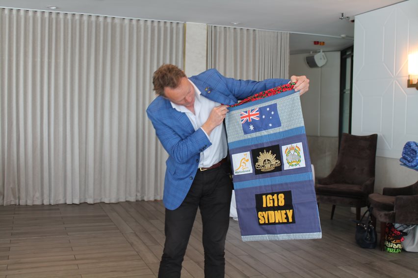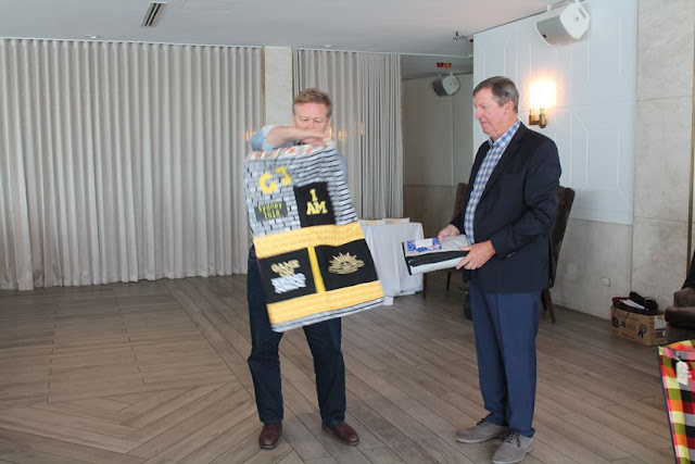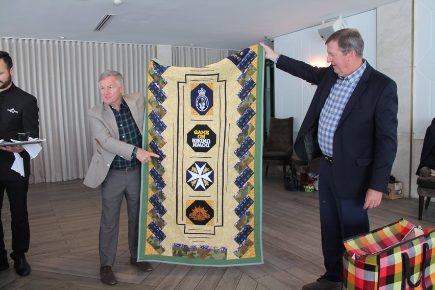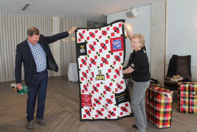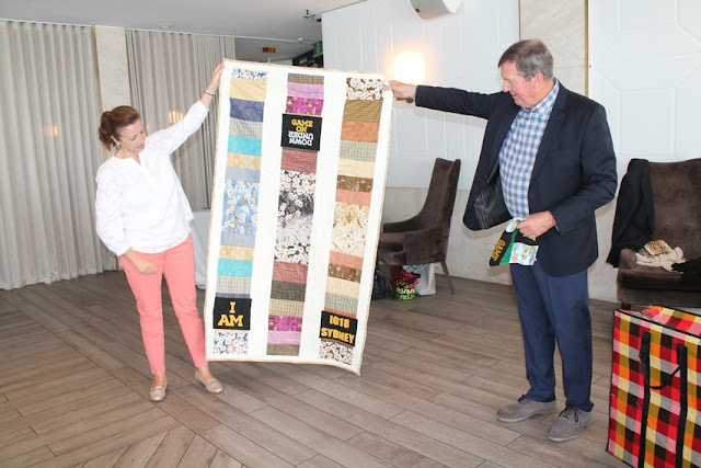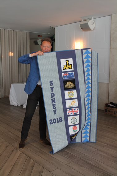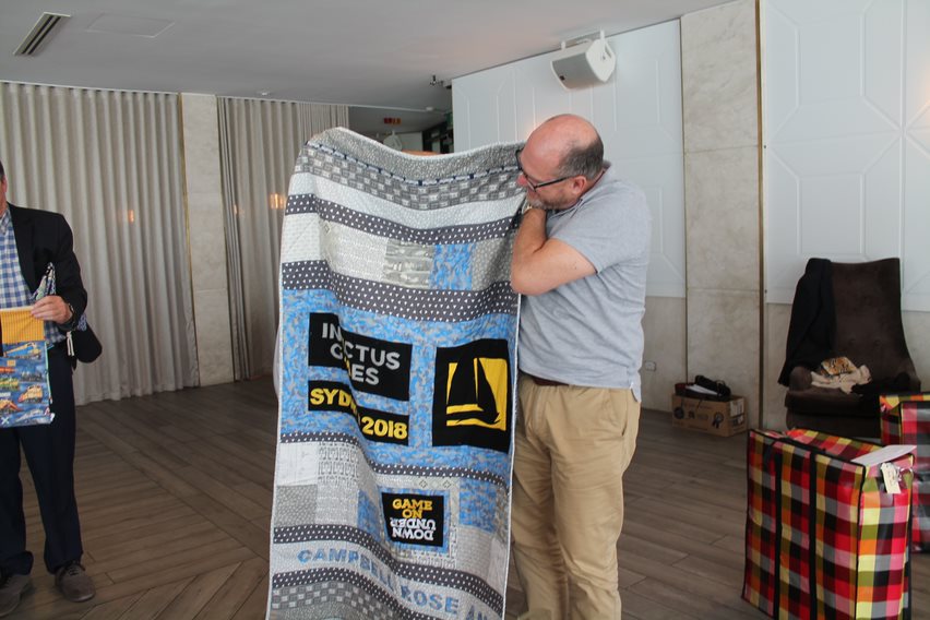 So here are the photos of the Board and the CEO being presented with their quilts and laundry bags at a special function the day after the closing ceremony of the Invictus Games. I am told that, without exception, all the quilts and laundry bags were very well received and everyone was blown away with them.