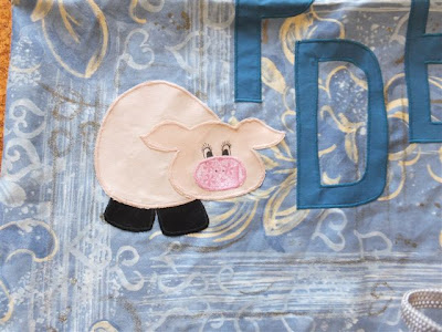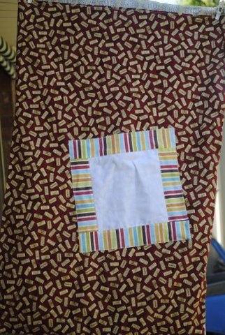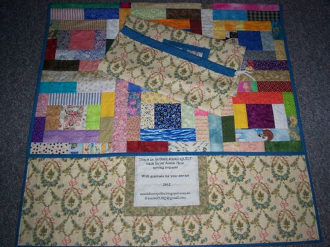 Caroline and I put this quilt top together. The centre is actually two pieced panels that were donated by my friend, Del. Caroline and I used material donated by the Original Aussie Hero’s wife, Jenny to border it and back it and then Caroline quilted it on her new Sweet 16 (the teenager she calls it) and bound it.