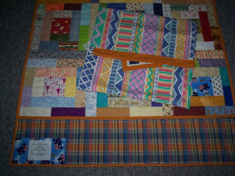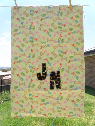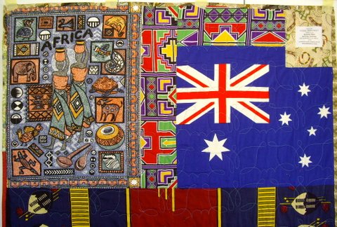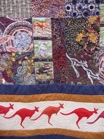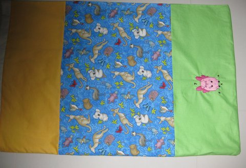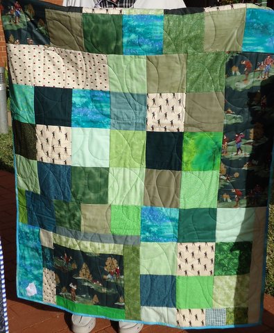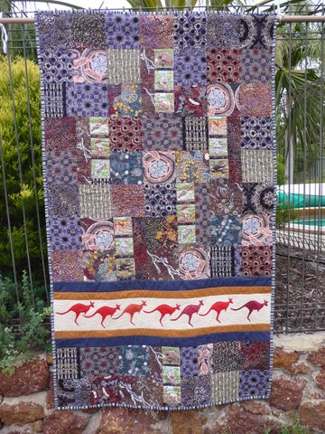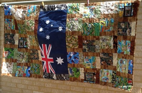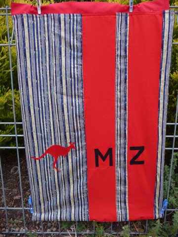 Please pass on my sincere thanks to Leonie and the other ladies who sowed their magic into such a beautiful quilt. The Kangaroo is a lovely touch too. The laundry bag is so nice that I don’t want to put my dirty smelly clothes inside – I am currently using it as a pillow!