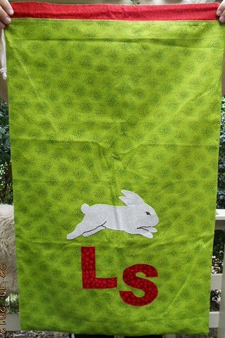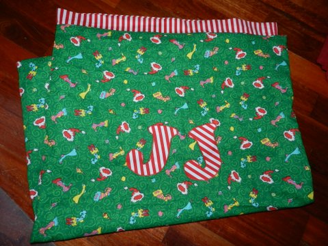 When Kim found out that the recipient loves Dr Seuss she donated this piece of Xmas fabric so what else would you do with it but make a santa sack laundry bag to send along with the bag!